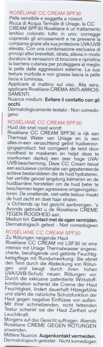 Uriage Roseliane CC Cream SPF30 is een rijke verzorging voor de huid. De crème is speciaal ontwikkeld voor de snel rood wordende huid. De crème hydrateert en beschermt de gevoelige huid waardoor deze direct na het aanbrengen comfortabel aanvoelt. De crème corrigeert daarnaast ook de teint op natuurlijke wijze. Het camoufleert de rode (vlekkerige) huid waardoor deze weer gaat stralen. De textuur van de Roseliane creme voelt prettig aan, is niet vet en trekt snel in. De toegevoegde zonnebescherming SPF30 beschermt de huid optimaal tegen UVA en UVB.